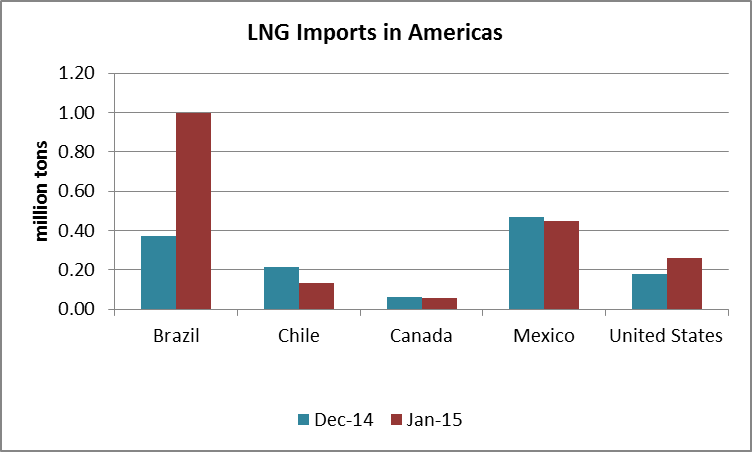 In the United States, LNG imports rose in January thanks to further deliveries from Trinidad and Tobago. The latter represented 0.21 million tons and were bought at an average price of $9.25/mmbtu. In January, only GDF Suez’s Everett terminal and Kinder Morgan’s Elba Island received shipments, while Repsol’s Canaport LNG in Canada also received a shipment from Trinidad and Tobago. As for Mexico, imports were flat at 0.45 million tons while Chile’s imports slightly decreased while Brazil’s imports increased by 0.63 million tons.