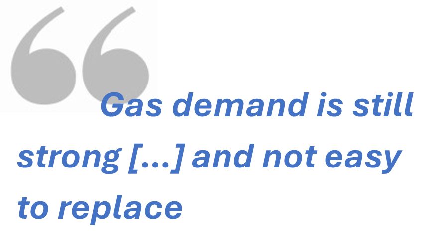 Gas demand is still strong, and it is not expected to drop as fast as many are depicting. It is still above 400 Bcm in the EU, so it is significant and not easy to replace. Gas is needed for flexibility and to manage the fluctuations inherent to the intermittency of renewables. It then remains key for hard-to-abate industries to produce final goods. Ultimately, natural gas is also an essential resource needed to compensate the potential delays that may arise in deploying the new technologies envisaged by the energy transition.