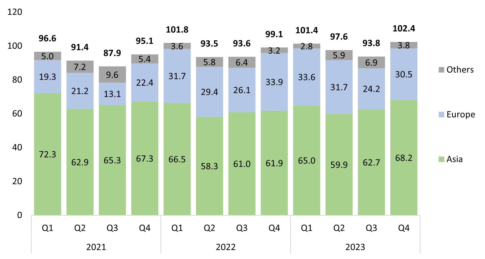 Global LNG imports in 2021-2023 by quarter, mt