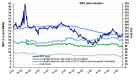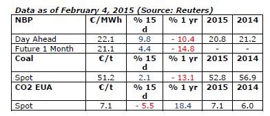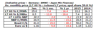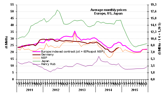 In January, the indicative European price (the LT 60%) stood at €25 /MWh ($8.5/MBtu), more than 7% lower than in December. The LT 60% price will gradually reflect the sharp drop in the oil price whose value, expressed in dollars, was 57% lower in January than in June (50% lower when expressed in euros). Given the impact of this downswing on drilling activity in the United States, the markets reacted strongly on February 2, with the Brent at $54/b compared to the January average of $47.7/b. This fairly violent reaction translates uncertainty as to the equilibrium price that would eliminate this year’s oversupply. The connection between the decline in prices and that of drilling in the U.S. (-23% since September) and, ultimately, that of U.S. production, remains uncertain. If one were to take the present Brent price of $57/b as the average for 2015 ($54/b a month ago) and the euro at $1.15, the LT 60% price would be €20.4/MWh ($6.9/MBtu) in August, i.e. 24% less than in December. The annual average for 2015 is currently estimated to be €22.2 /MWh ($7.4/MBtu), 15% below the 2014 average.