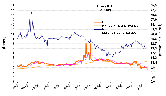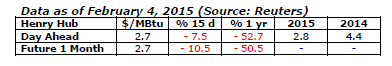 The HH price continued to slide in a movement that began last November. In early February, it was pegged at $2.7/MBtu, i.e. 35% lower than in November ($4.1/MBtu). In 2012, too, very low prices were reported in January, bottoming out at $2 in April. It took a year to return to $4. The forward markets are expecting a similar scenario with an average price of $2.8/MBtu for 2015.