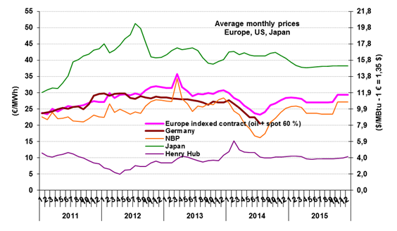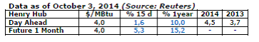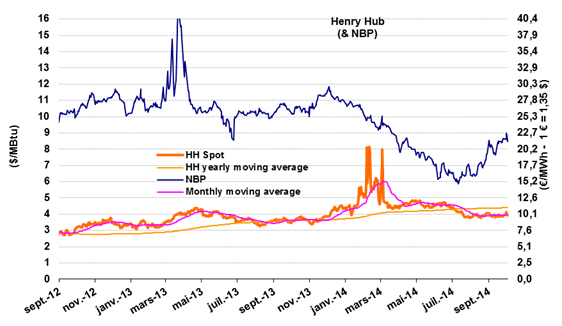 The HH price has remained flat since the month of August, averaging about $4/MBtu per month with a minimum of $3.8 and a maximum of $4.1/MBtu. The business environment continues to be affected by the gradual replenishment of stocks. The most recent statistics from the DOE indicate a stockpile of 88 Gm3 (3100 Bcf), i.e. only 7 to 15 Gm3 (250-530 Bcf) below the minimum and maximum 5-year prices (with a deficit of between 20 and 40 Gm3 at winter’s end). So the replenishment of stocks is no longer a matter for concern. As for shale gas, annual output was estimated at 354 Gm3 in August, up by 43 Gm3 in one year, including 33 Gm3 from the Marcellus Formation (120 Gm3 produced) and 11 Gm3 from Eagle Ford. On the other hand, mention should be made of the substantial decline reported for the Haynesville Shale (a drop of between 16 and 42 Gm3) due to economic reasons (it mostly produces dry gas).
