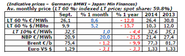 The indicative European LT price (60% spot indexation) was €26.1/MWh ($9.9/MBtu) in September, nearly 9% higher than the average for the month of August. This trend reflects the very strong progression of prices on the spot market (+20% for the NBP). This rise was curbed in part by the downtrend of Brent expressed in euros (-9.9% in one year). Based on current expectations for the NBP, the LT 60% spot-indexed price should continue to climb over the winter (€28.5/MWh or $10.4/MBtu in December).