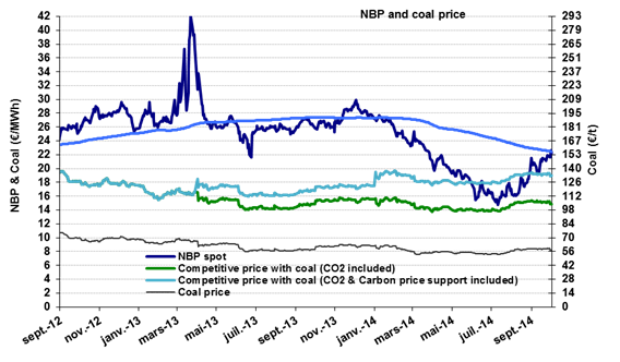 The NBP Winter price generally fluctuates within a fairly broad price range. Barring extreme circumstances, the floor price is the price enabling gas to compete with coal (€19/MWh or $7/MBtu) and the ceiling is the price at which LNG cargos are diverted from Asia to Europe. If the LNG price is $14-15/MBtu in Asia, the price in Europe would be $11-12/MBtu(€29-32/MWh). Current expectations fall somewhere between these two extremes.