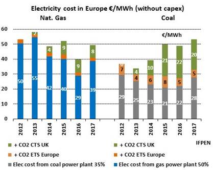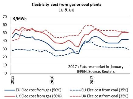 In Europe, the price of 100% oil-indexed contracts could gain between 13 and 37% in 2017. The upper limit value is based on mid-January forecasts for the Brent price ($56/b) and the euro ($1.07). This type of contract is used less and less in Europe. In France, for instance, it is estimated that nearly 80% of contracts are now indexed to market prices (short-term, spot or equivalent). Nevertheless, oil-indexed contracts continue to have an influence, serving as a yardstick for prices in a tight market. This occurs in winter, when spot prices for gas are likely to approach or exceed long-term prices, depending on the severity of the weather conditions. On the other hand, spot prices in summer are generally lower than the indexed prices. The indexed prices in Asia could reach €27/MWh in 2017 ($8.5/MBtu) compared to €21.8/MWh ($7.1/MBtu) in 2016. Unlike in Europe, long-term oil-indexed contracts still represent a preponderant share of supplies: 70% in 2014, according to the EIA. The historic purchasers of LNG are trying to renegotiate the historic formulas applied to long-term contracts. They wish to improve the coefficients linking the price of gas to that of oil and strengthen references to spot market quotations. They are also seeking larger spot-based deliveries, especially from the United States. These short-term prices came under fairly strong pressure between December and January, reaching $9/MBtu, thus exceeding the price of long-term contracts. The markets expect demand to fall off in the spring, at which time the gap between European and Asian spot prices should narrow?. Henry Hub: $3-3.5/MBtu in 2017 ($2.5/MBtu in 2016) Mensual gas prices 2016-2017 In the United States, it is thought that the Henry Hub price for 2017 will be in the $3-3.5/MBtu range. Compared to the 2016 price of $2.5/MBtu (€7.8/MWh), this would represent a progression of between 19 and 37%. 2016 was marked by a drop in production and cold winter conditions making it necessary to draw on stocks. These two factors explain why the price rose during the year. For 2017, the production increase should be absorbed by growth in demand and, especially, in exports (+15 bcm for LNG). This should lead to a downdraw estimated at 10 bcm, like in 2016 but in contrast with year-end 2015, when there was an accumulation of stocks (+21 bcm). The U.S. price, expected to come under pressure for these reasons, remains fairly low compared to the prices in Europe and Asia. In any case, the projected stock level is a parameter that will help determine the equilibrium price for the United States. The impact of gas and coal price trends on the cost of electricity in Europe