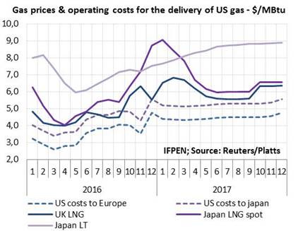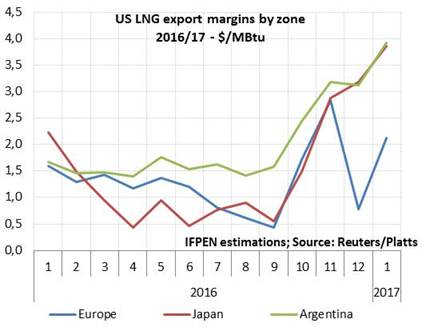 Along with higher gas prices, the markets expect 2017 to bring a sharp increase in the coal price, whose annual average should jump from $59/t to 76/t. However, the coal price is expected to decline steadily throughout the year. These two energies play a significant role in the formation of the electricity price. In the United Kingdom, the price is primarily based on the maximum cost of producing electricity from coal or gas. The parameters are a bit more complex in France or Germany. One must also account for the fact that different CO2 prices are retained: €5/TCO2 for Europe versus €26/TCO2 for the U.K. (including the carbon tax). Since the carbon tax doubled in April 2015, it has ensured that gas is competitive with coal in the U.K., which will continue in 2017. On the Continent, however, gas will be less competitive than coal. One notes that the carbon tax increases the cost of generating electricity, which is why electricity market prices are higher in the United Kingdom (€50/MWh in 2016) than on the European continent (€30/MWh in Germany and €34/MWh in France). Report on U.S. LNG