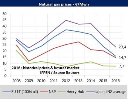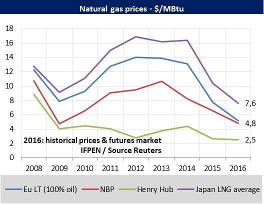 The Henry Hub price for 2016 has hovered in a very low range ($2.2 to 2.5 /MBtu) since the beginning of the year, with an upturn starting in May. The high level of stocks, owing to a mild winter, kept prices low until May. Since then, they have made large gains (+30% in June, to nearly $2.9/MBtu), driven by uncertainties as to the actual level of future production as well as demand from the power sector (the “air conditioning effect”). The increasing sensitivity of gas prices to high temperatures can be attributed to the rise in gas’s share of the electricity production market. In 2015, that share reached 33%, equivalent to that of coal, as opposed to 20% ten years ago, when coal represented 50%.