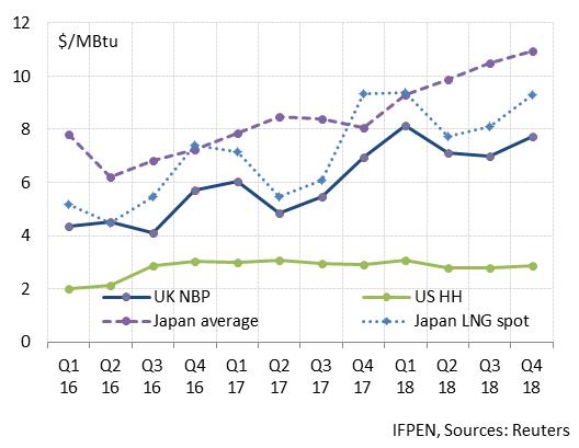 In the U.S., an especially harsh winter caused the monthly Henry Hub price to peak in January ($3.9/MBtu), with a daily peak occurring on January 3 ($7.5$/MBtu). This episode did not last long, however. Since February, the Henry Hub price has been in the vicinity of $2.7-2.8/MBtu. The markets anticipate that it will edge up towards $3/MBtu towards the end of the year. Based on current assumptions, it is thought that a Henry Hub LNG price of $3/MBtu will ensure the competitiveness of U.S. LNG on a full-cost basis on the European and Asian markets (Figs. 7 & 8). This was rarely the case in 2016 and 2017, given the low level of European and Asian prices.