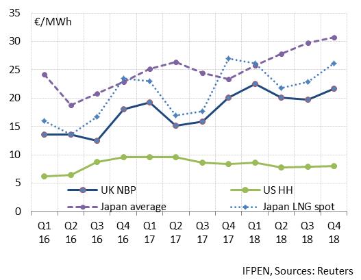 Gas price, by quarter: U.K., Japan and the U.S. ($/MBtu and €/MWh)
