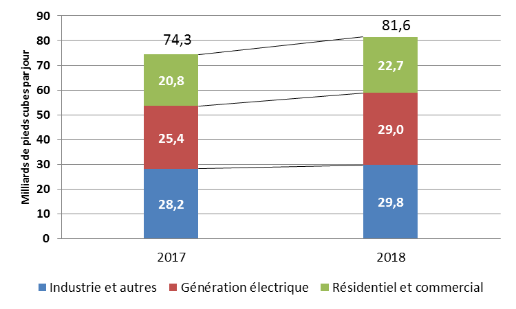 Between February and October, the price rose from $2.67/MBtu to $3.28 $/MBtu. It was under pressure mostly because gas consumption increased significantly in 2018 (Fig. 2) in spite of a strong increase in output (Fig. 3). The rise in consumption was mainly due to the replacement of coal-fired power plants with gas-fired units. Gas consumption in the electricity sector was 14% higher than in 2017. A surge in industrial investment (e.g. for the production of methanol, ammonia and urea-based fertilizers) as well as demand for energy to heat or air-condition physical premises contributed to this annual increase in the industrial (+6%), commercial and residential (9%) sectors.