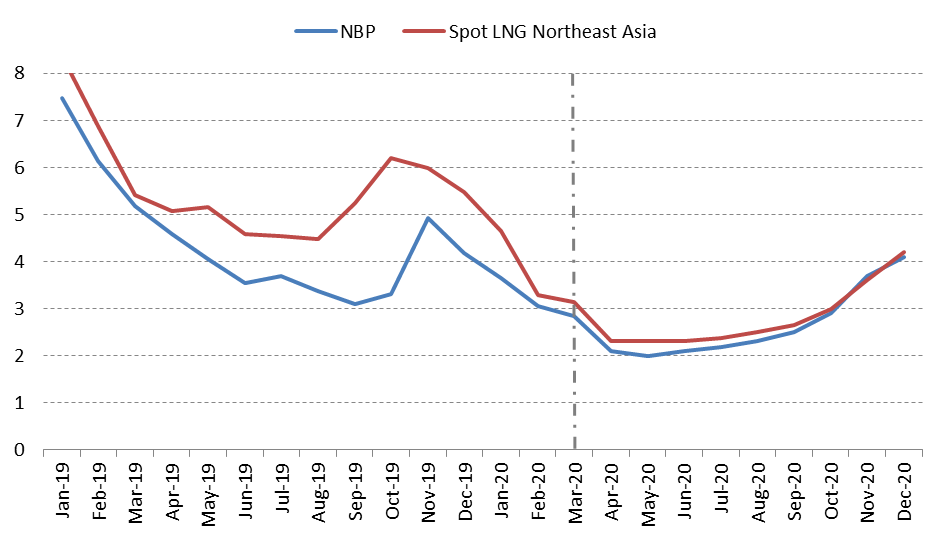• Before the spread of the 2019 novel coronavirus disease (COVID-19), spot gas prices were already at seasonal lows due to LNG oversupply, an unseasonably mild winter in the northern hemisphere, economic turmoil (trade war between the United States and China) and renewed confidence in future pipeline gas supply in Europe.