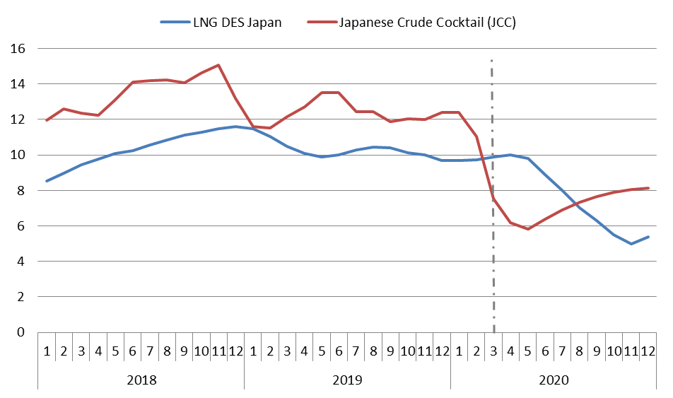 Figure 2: Evolution of the Japan LNG price versus JCC ($/MBtu)