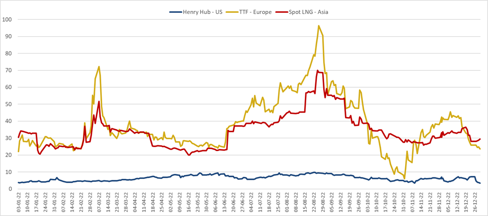 Figure 1: Evolution of daily international spot gas prices in 2022 ($/MBtu)