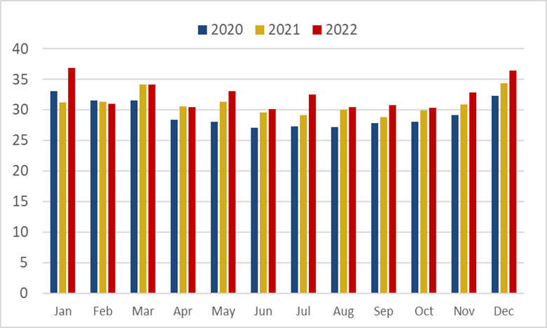 Figure 2: Evolution of monthly global LNG supply (Mt)