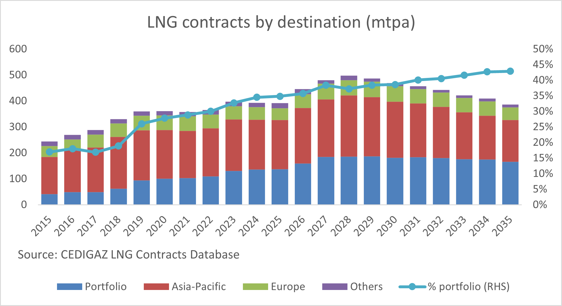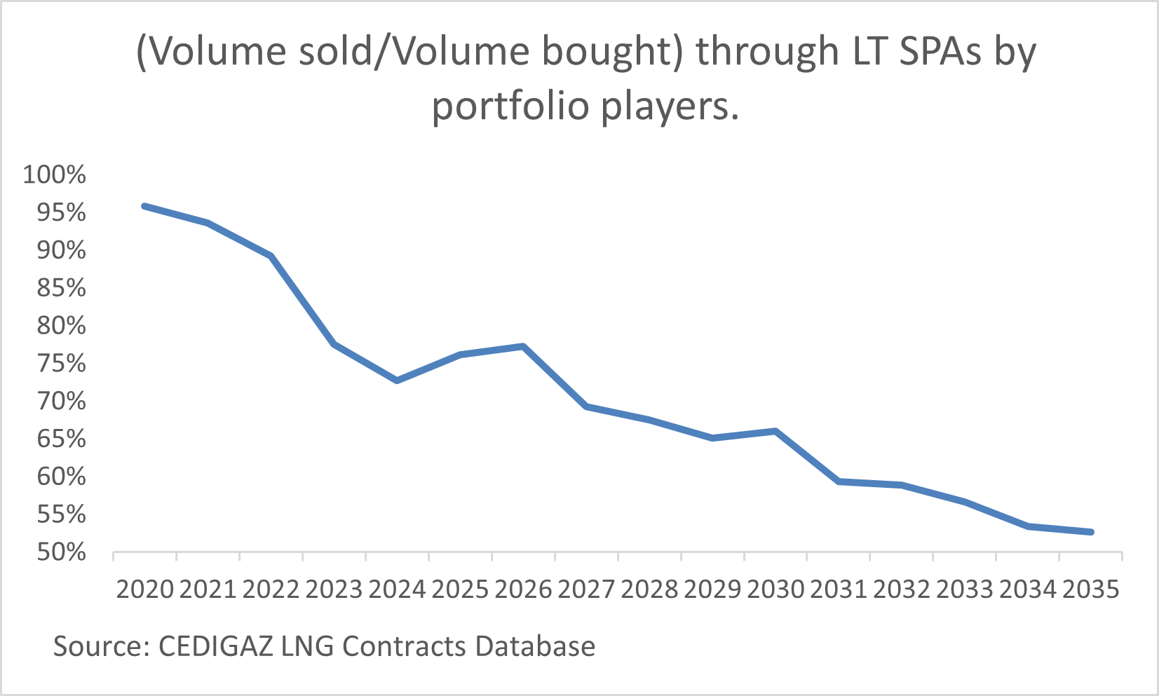 As shown in the chart below, portfolio players’ long-term import volumes (volumes bought) increasingly exceed their export commitments (volumes sold). This indicates that portfolio companies are relying more on the spot market to place uncommitted cargoes.
