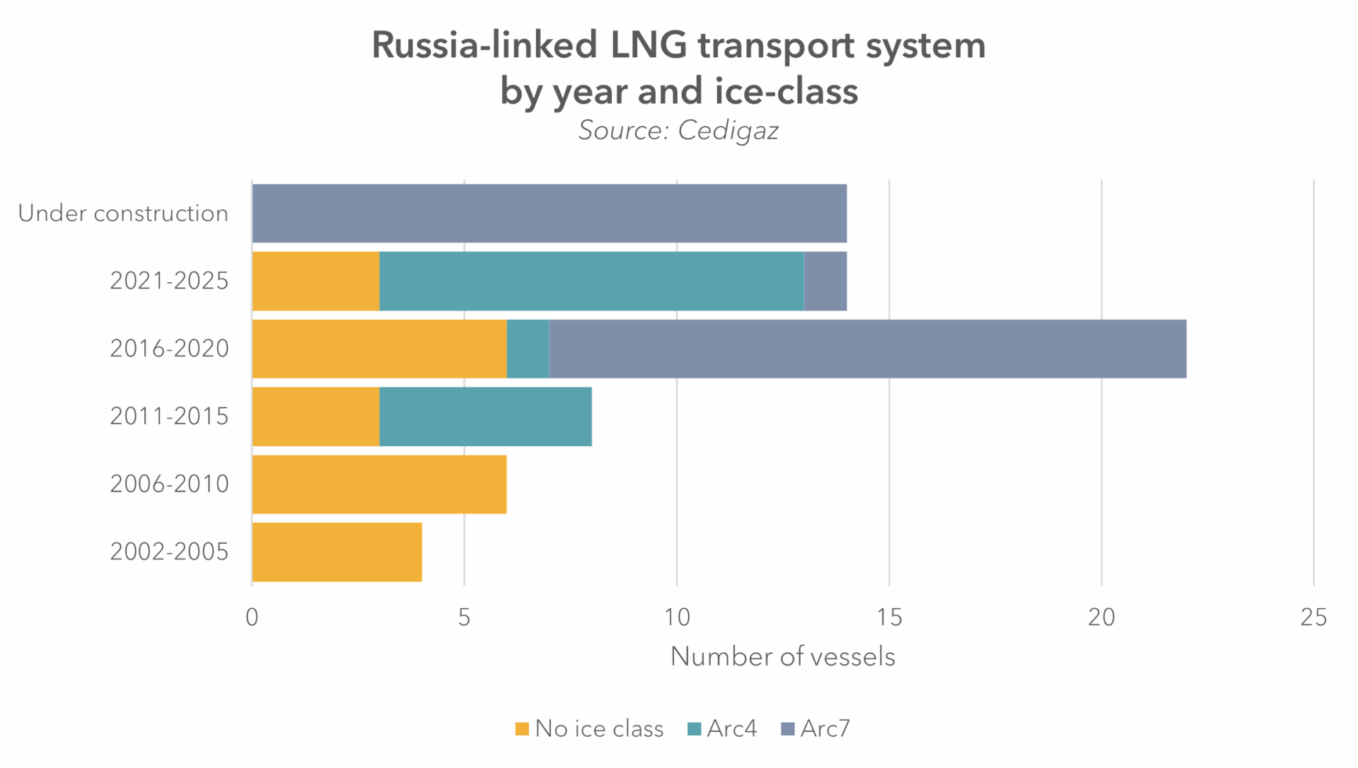 This figure includes dedicated Arctic carriers, newly built intermediate tonnage, conventional LNG carriers repositioned into Russian trade, and vessels under construction for Arctic LNG-2.