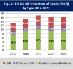 By way of comparison, the EIA is projecting that, for 2020, annual production on land[1] (Alaska and the Lower 48 states) will be 9.4 mb/d, down by 1 mb/d (-9 %) in one year. Total annual production, including NGL and Gulf of Mexico (GOM) output, is expected to be 16.2 mb/d, down by 0.8 mb/d (-5%) in one year. In 2020, shale oil has accounted for 58% of U.S. liquid hydrocarbon output, oil from the Gulf of Mexico 12% and natural gas liquids (NGL) 31%. For 2021, the EIA expects that the total U.S. NGL output will remain virtually stable, registering a decrease of 0.25 mb/d that will be offset to a large extent by offshore production in the Gulf of Mexico.