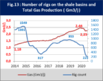 In April 2020, the price per barrel fell to USD 17, causing a dip (-2.4 %) in shale gas output in twelve months (Fig.13). Compared with the December 2019 high of 2.46 bcm/d, the decrease in output is more pronounced (-8.5%), due in large part to the drop in shale oil production. More than 30% of the gas produced comes from three shale oil basins (Permian, Eagle Ford and Bakken) whose shale gas output (0.67 bcm/d) represents more than 40% of their total production.