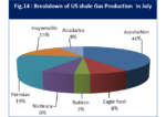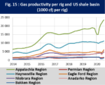 The Appalachia Basin (Fig.14) accounts for 41% of shale gas production, followed by the Permian Basin (19%) and the Haynesville Basin (15%). Over a one-year period, these three were the only basins that managed to stabilize output and report modest growth (between 1 and 3%); production was down at all of the other basins.
