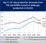 According to IFPEN’s “median” scenario, (Fig. 16), U.S. shale gas production (Fig.17) will fall to 2.17 bcm/d by year-end 2020, then to 2.09 bcm/d by July 2021. Here, output will continue to fall, but drilling activity will rebound slightly (+10 %) by the year-end and continue at the same pace to reach 275 active rigs in one year.