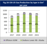 By way of a comparison, the EIA forecast for 2020 (Fig.18) projects that the annual output of gas (both conventional and unconventional) will be 990 bcm, a decrease of 4% in one year. Here, offshore production in the Gulf of Mexico will still represent about 3% of total U.S. gas output with production on land (Alaska and the Lower 48 states) accounting for 97%.