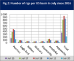 In July 2020, 225 new drill rigs were reported for that month, compared to 847 one year earlier. Activity retreated by 85% due to the drop in barrel price and Covid-19. The monthly average for the barrel price had plummeted from USD 60 in December 2019 to USD 17 in April 2020, then climbed back to USD 41 in July 2020. All basins were affected by this downtrend (Fig.2). Haynesville and Appalachia put up the strongest resistance, reporting declines in activity of 38% and 56% respectively.
