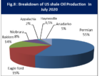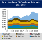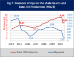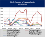 The drill rig count hit a record 1549 in October 2014 (Fig.1) prior to the drop in barrel price in 2015. In May 2016, the count sank to a low of 317 active rigs. Since July 2020, the number has fallen farther still. The Permian Basin is seeing the most drilling activity (125 rigs) and accounts for 56% of all rigs active at U.S. shale oil basins.