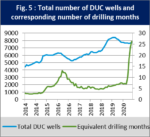 At times when the barrel price is low – as it has been since March 2020 – operators cut spending on drilling and rely on their inventory of already drilled wells waiting to be “completed”, i.e. transformed into producing wells. Figure 5 illustrates the inventory of DUC wells and what it represents in terms of the number of months equivalent of drilling. Like in 2016, the slowdown in the number of active rigs has generated a peak, reaching 26 months equivalent of drilling in July 2020. With an average productivity of 800 barrels per day and per rig at the basins, the inventory of DUC wells represents additional potential output of 11%.In July 2019, there were 8,400 drilled but uncompleted (DUC) wells. That number subsequently dropped and then stabilized in 2020 at around 7,700 (cf. Figs. 4 and 6). The Permian Basin alone accounts for 46% of DUC wells.